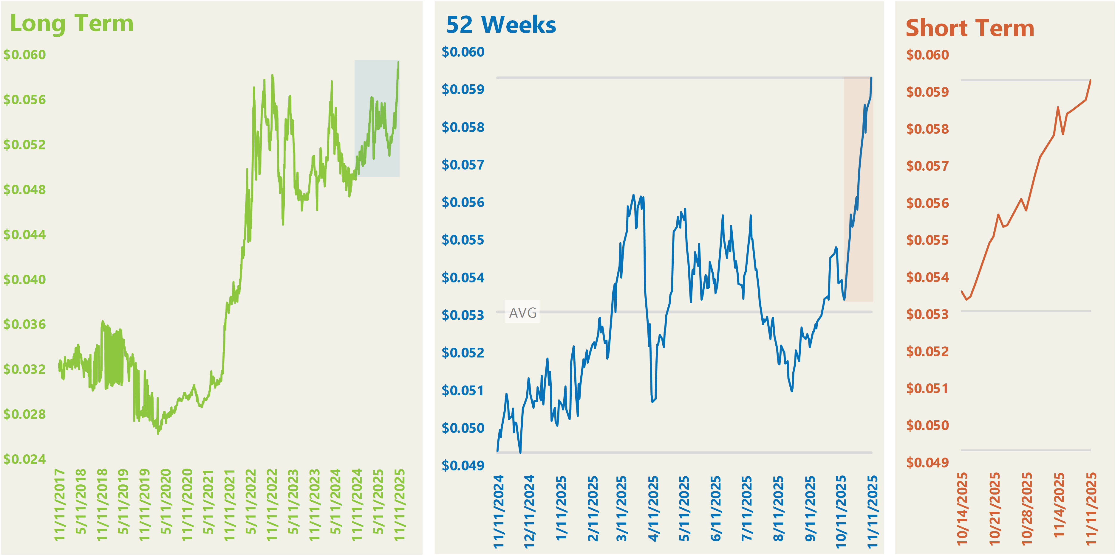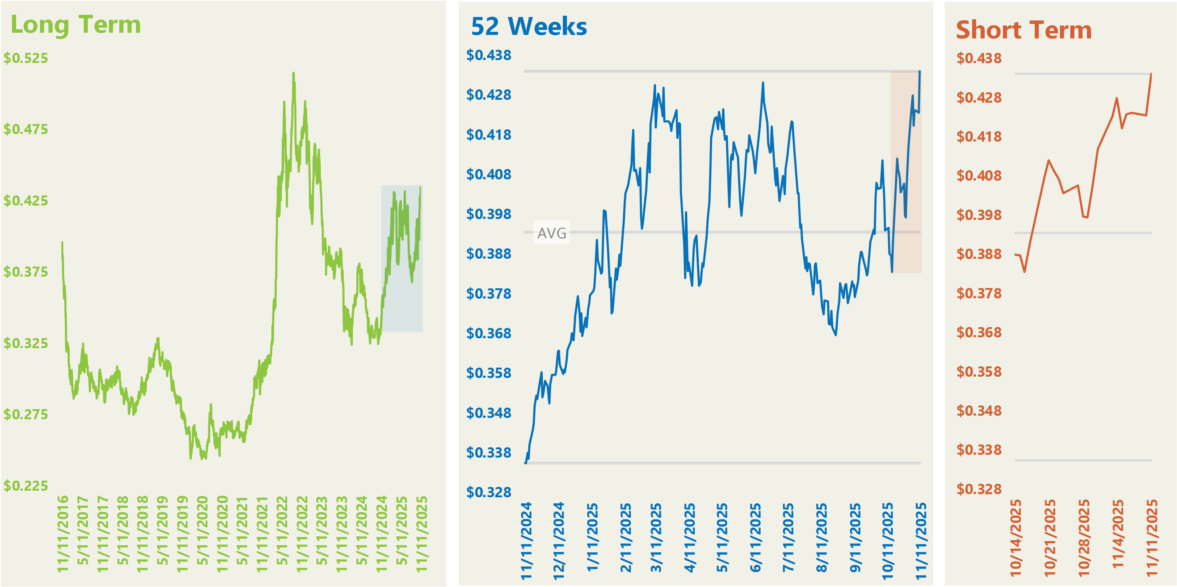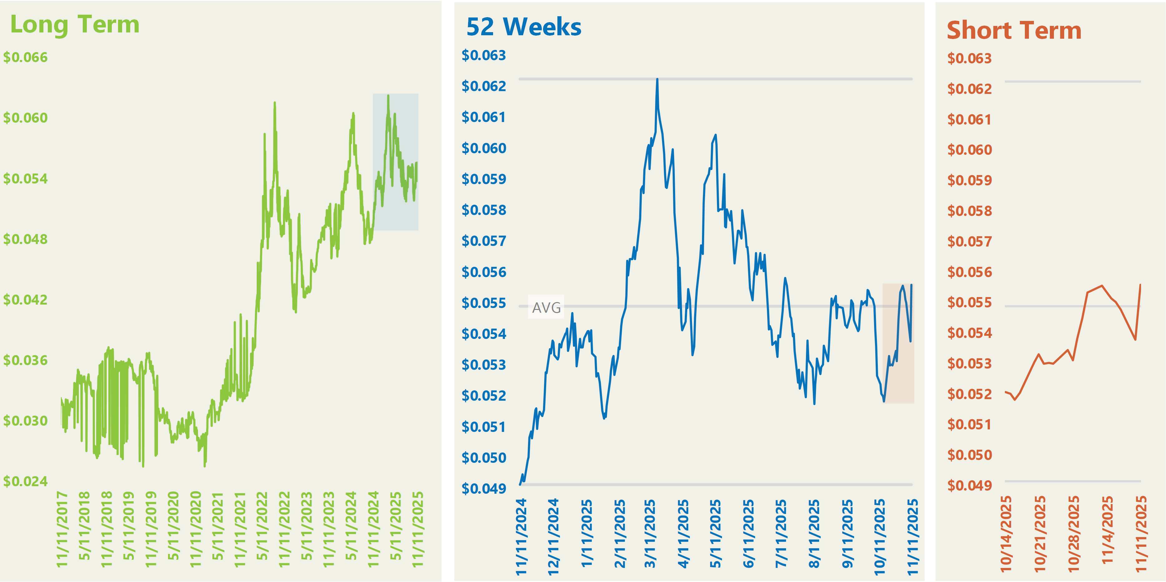 The graphs above show the price movement of Calendar Year 2026 TETCO-M3 Wholesale Naural Gas over various periods of time. The price of the calendar year is shown on the left y-axis in relation to the date of the pricing on the bottom x-axis. On the 52-week and short-term graphs, you can see the minimum, maximum, and average prices of the past 52 weeks indicated by the gray lines.