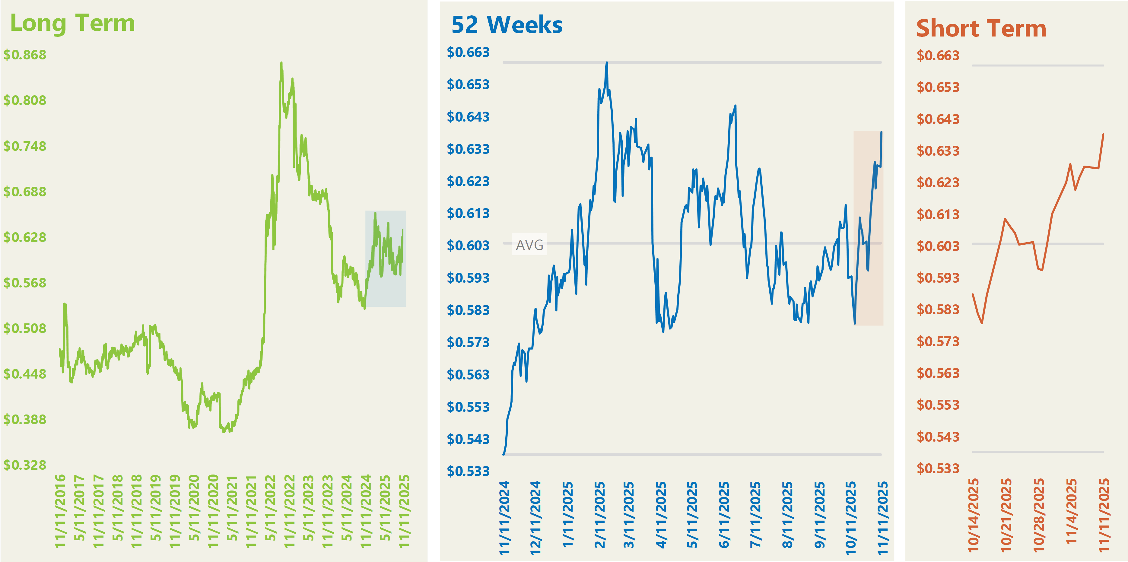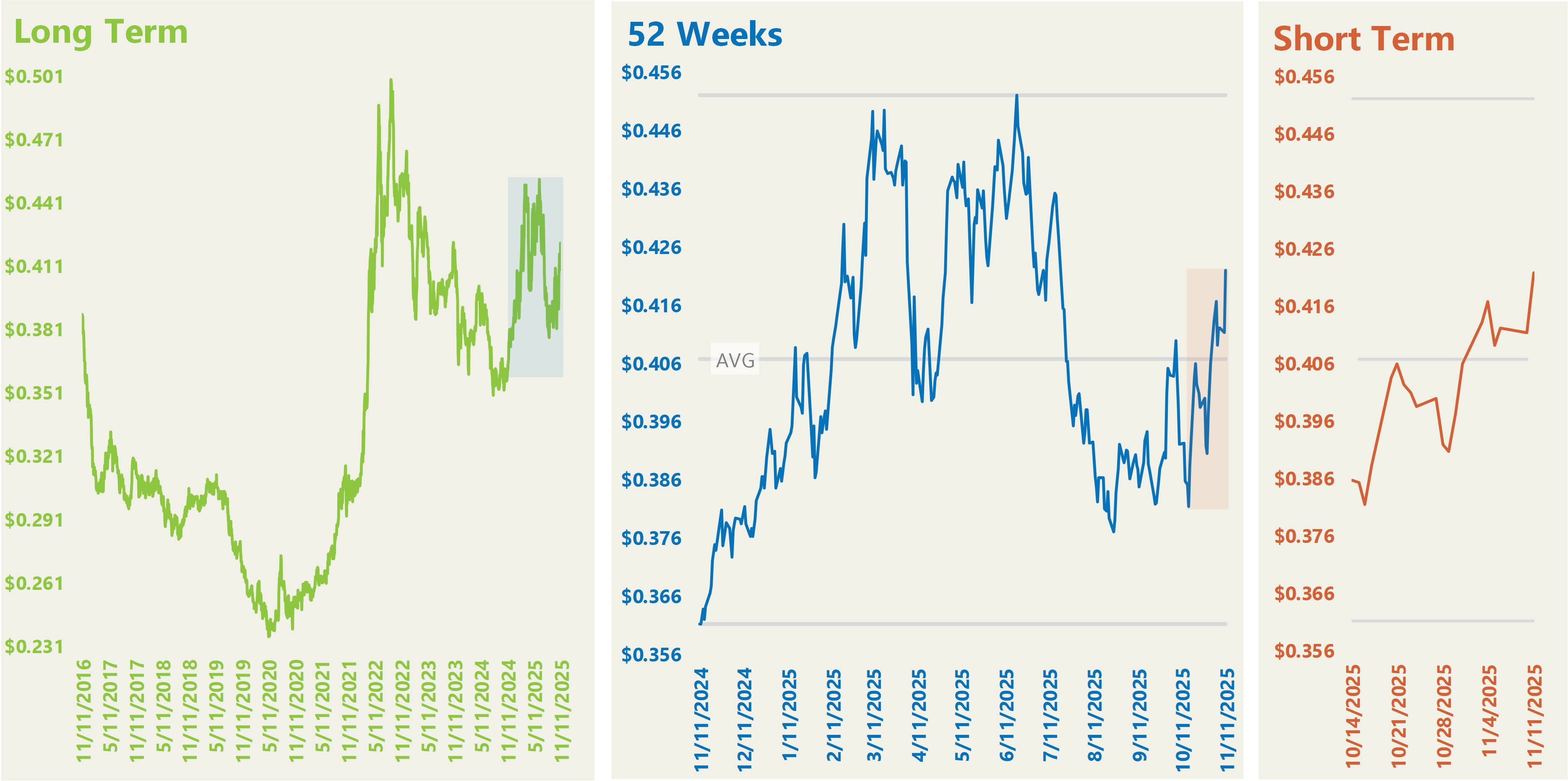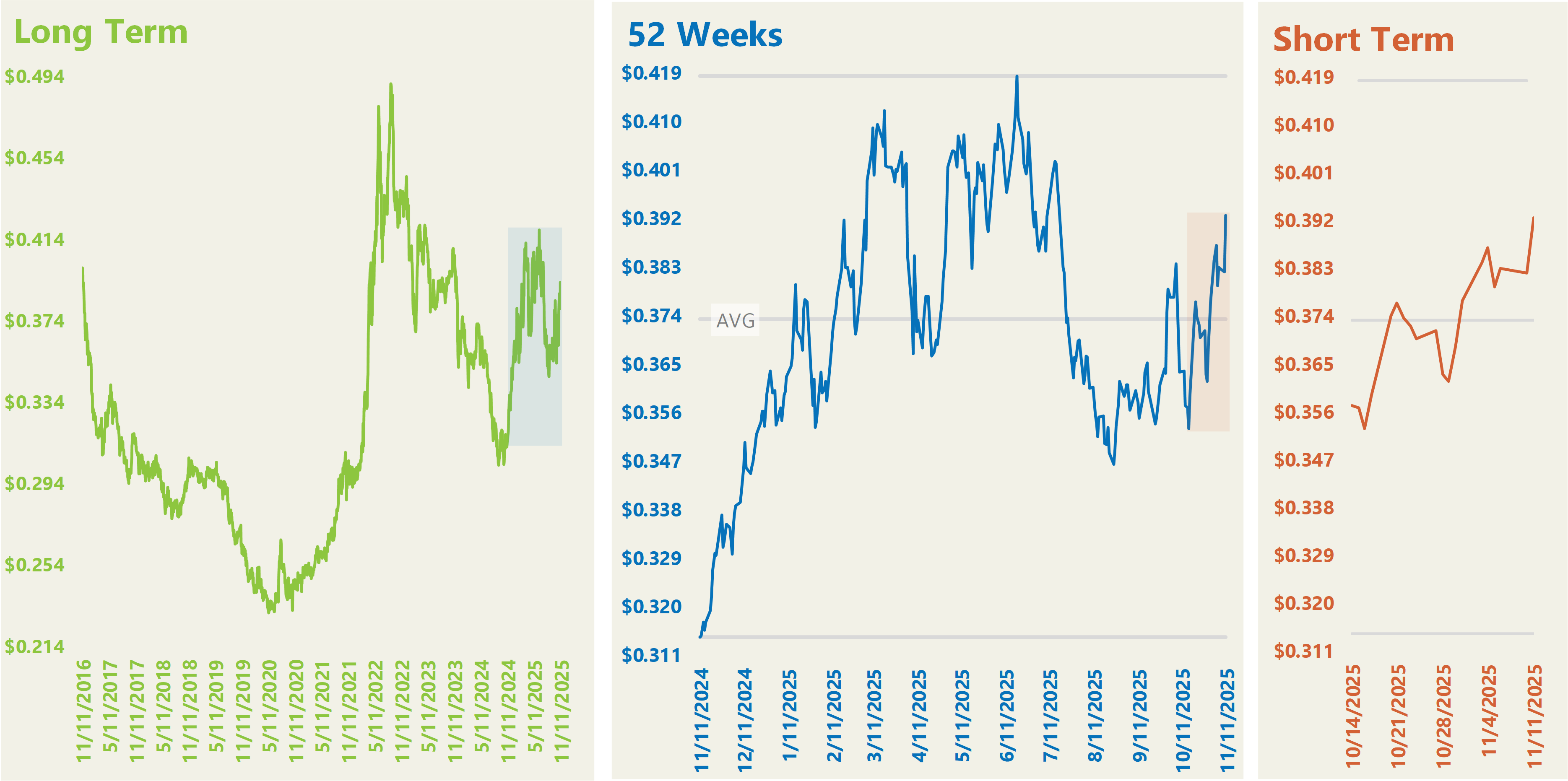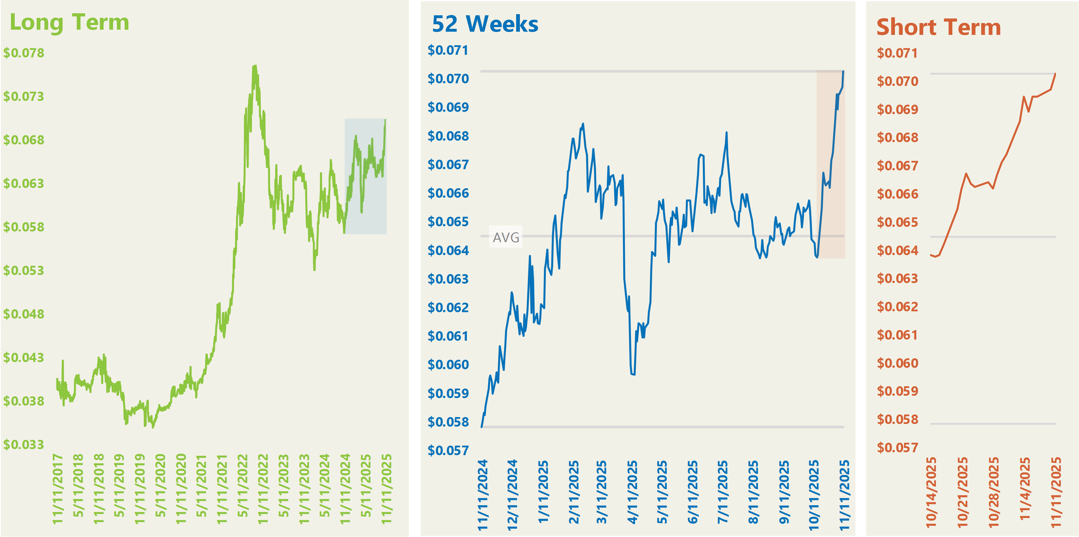 The graphs above show the price movement of Calendar Year 2026 TETCO-M3 Wholesale Naural Gas over various periods of time. The price of the calendar year is shown on the left y-axis in relation to the date of the pricing on the bottom x-axis. On the 52-week and short-term graphs, you can see the minimum, maximum, and average prices of the past 52 weeks indicated by the gray lines.
