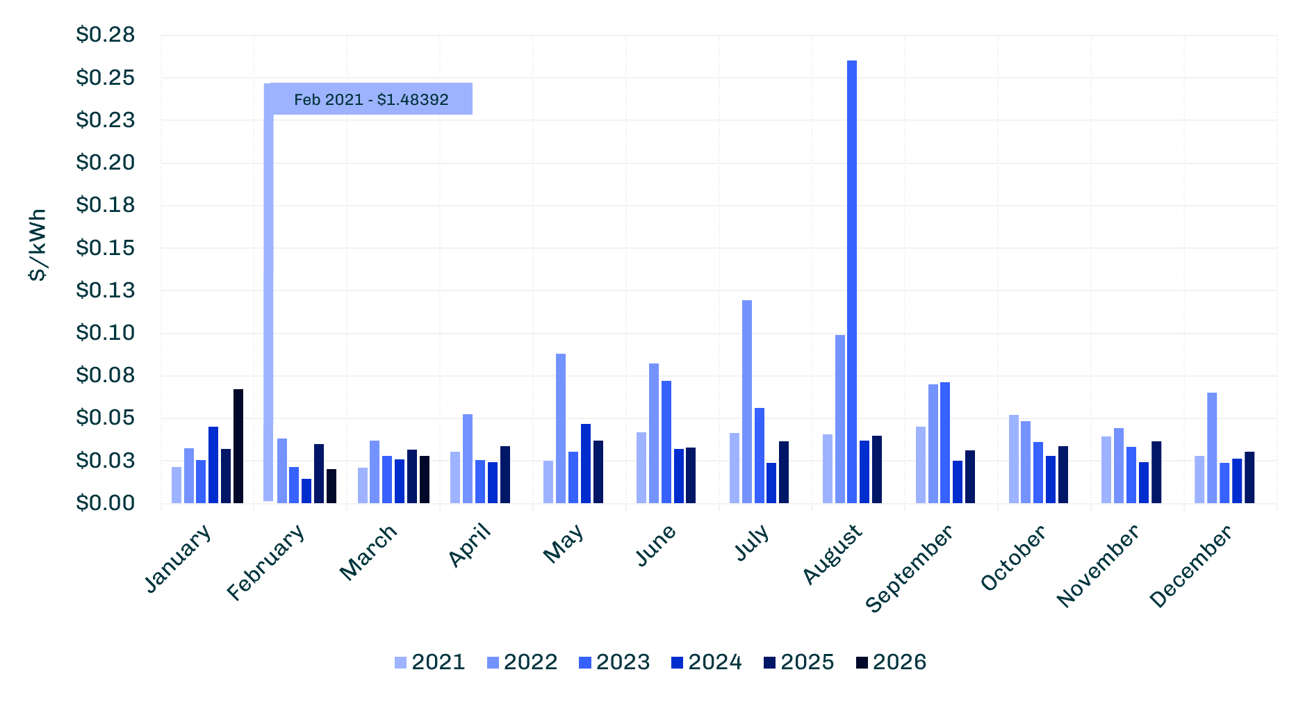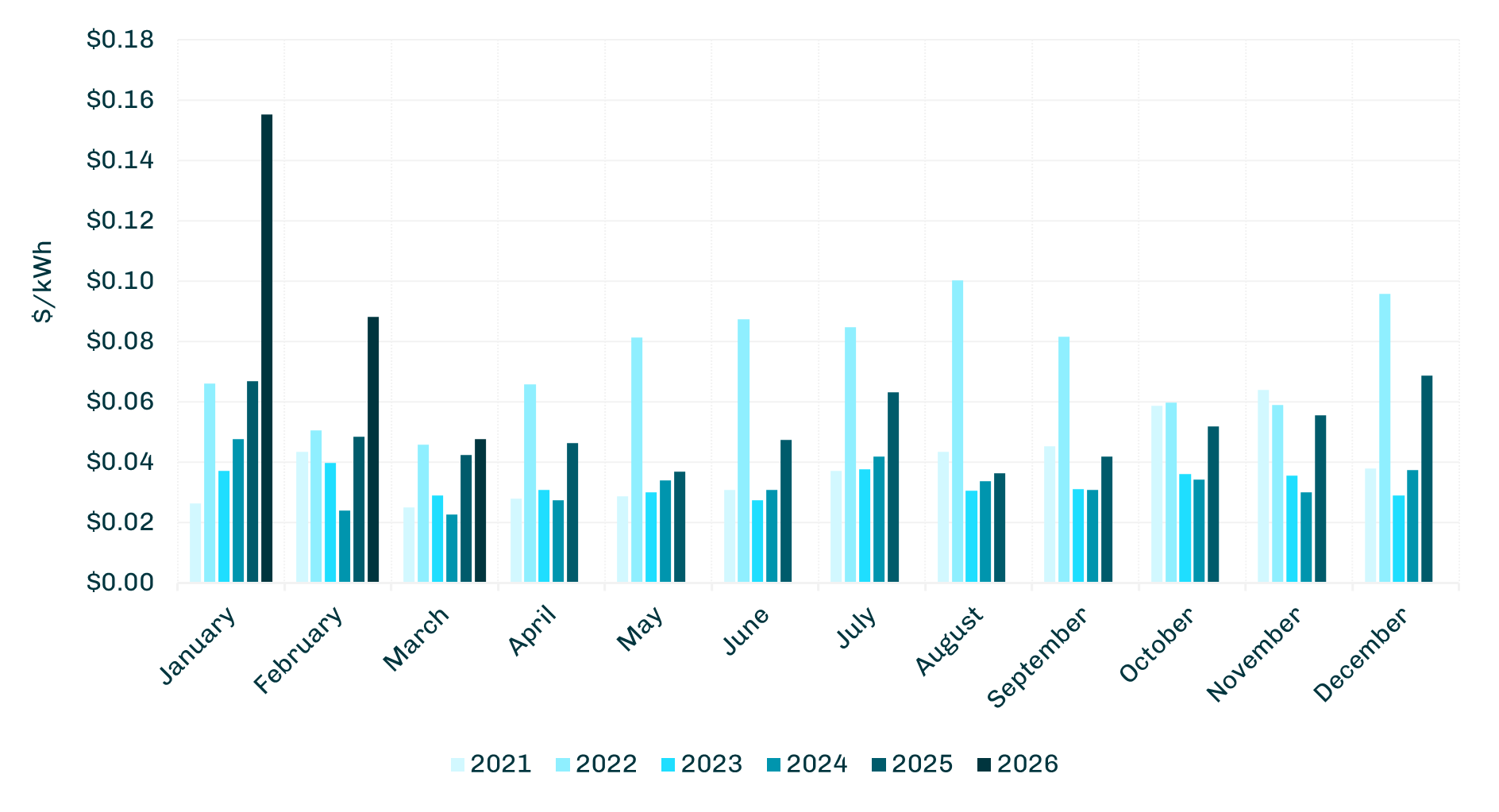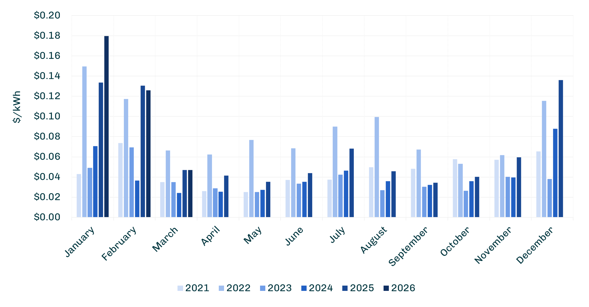 These graphs for each RTO display a multi‑year comparison of average monthly locational marginal prices (LMPs) for calendar years 2021 through 2026. Each month is represented along the x‑axis, with price shown on the y‑axis in dollars per kilowatt-hour. Color‑coded bars indicate the monthly average for each year, allowing a clear year‑to‑year comparison of monthly pricing across the six-year period.
