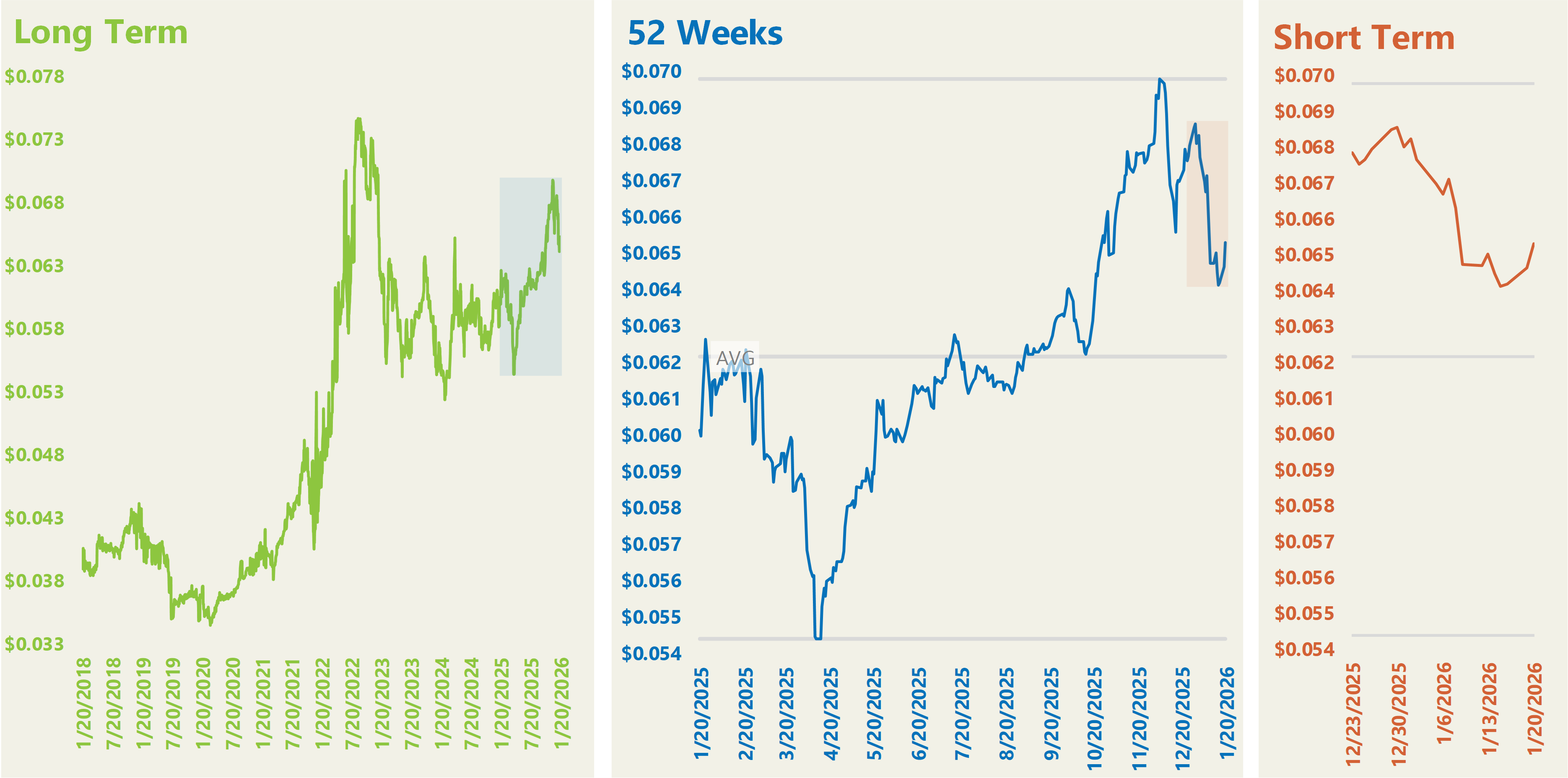 The graphs above show the price movement of the Calendar Year 2027 Henry Hub Wholesale Natural Gas over various periods of time. The price of the calendar year is shown on the left y-axis in relation to the date of the pricing on the bottom x-axis. On the 52-week and short-term graphs, you can see the minimum, maximum, and average price of the past 52 weeks indicated by the gray lines.