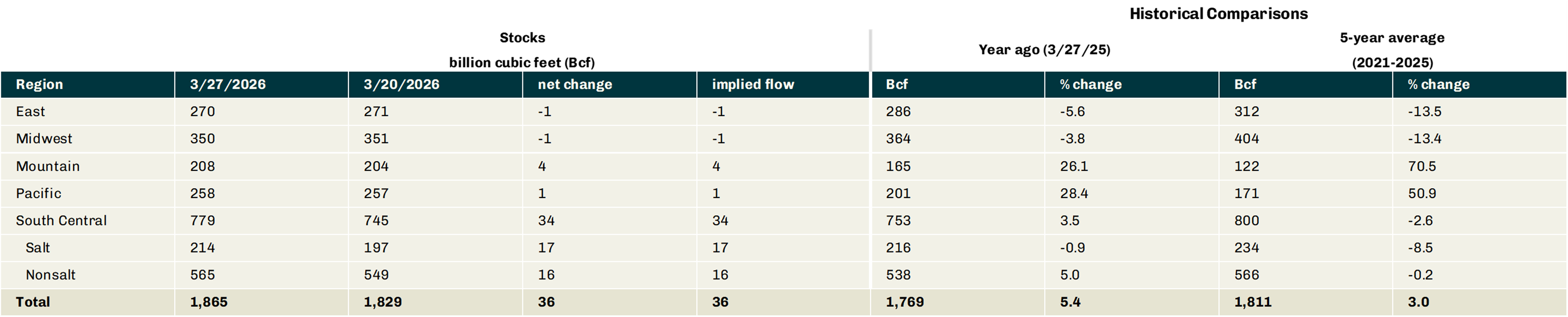 The total net injection for the week ending 3/27/26 was 36 Bcf.