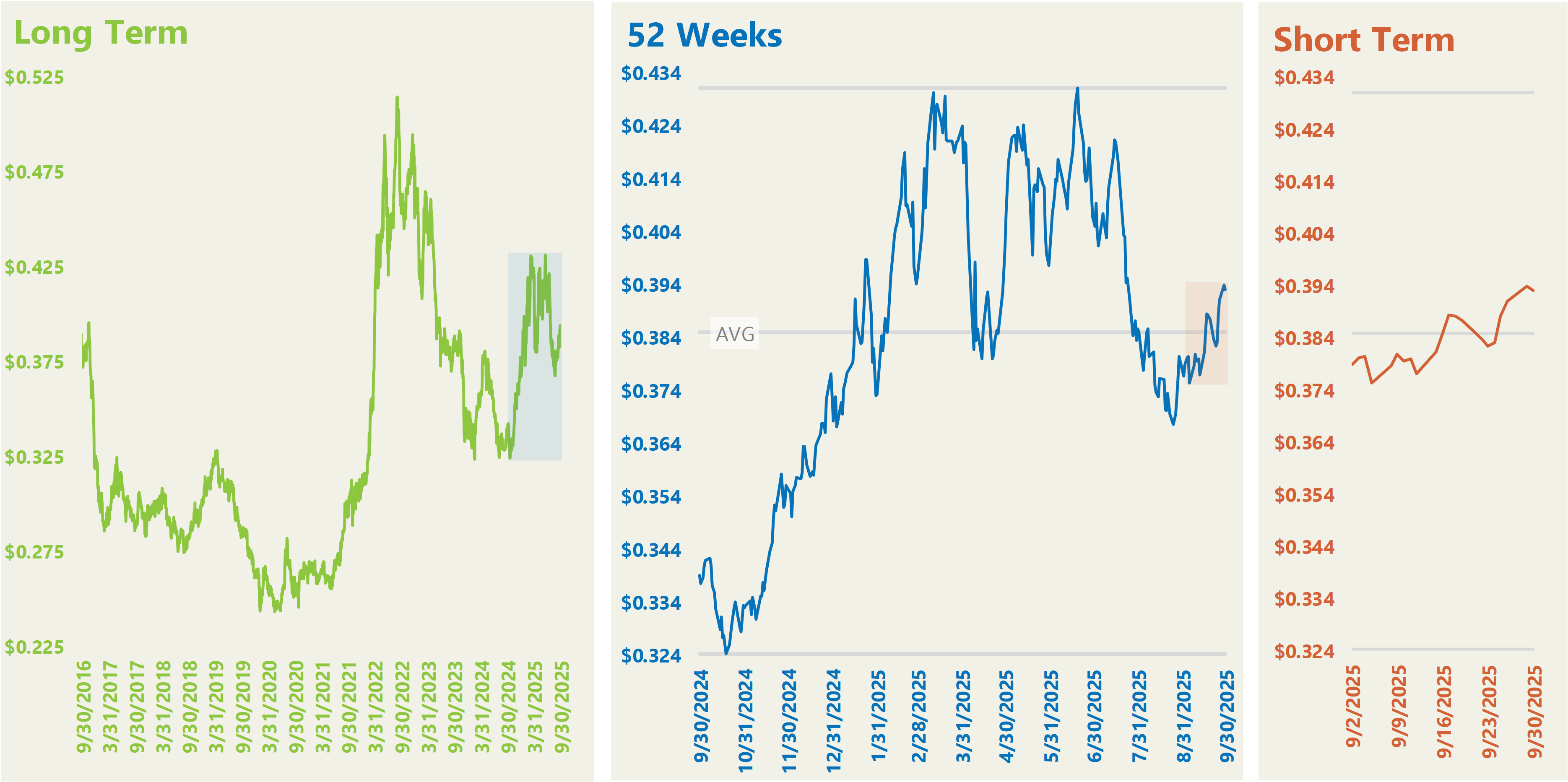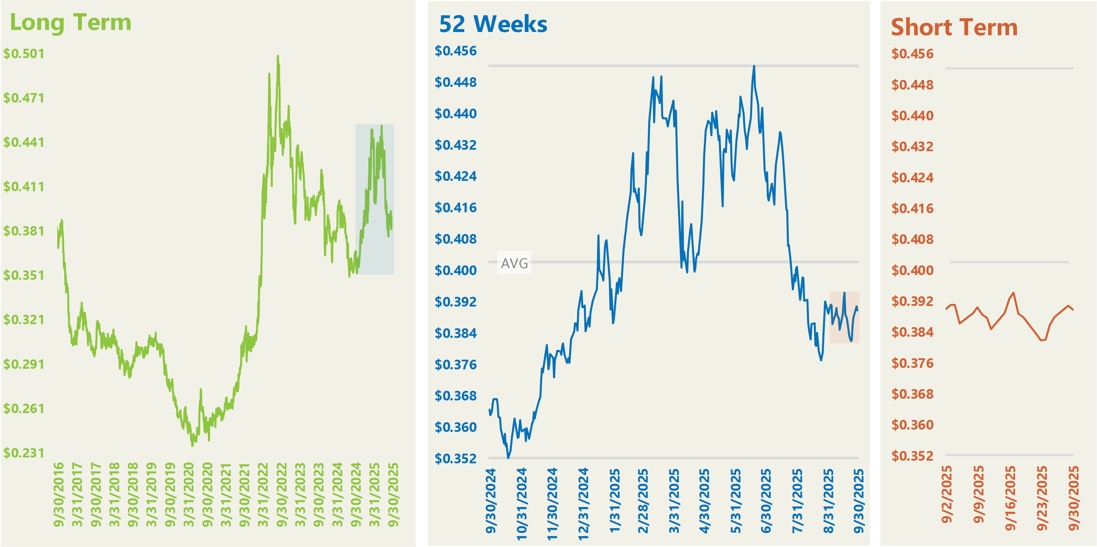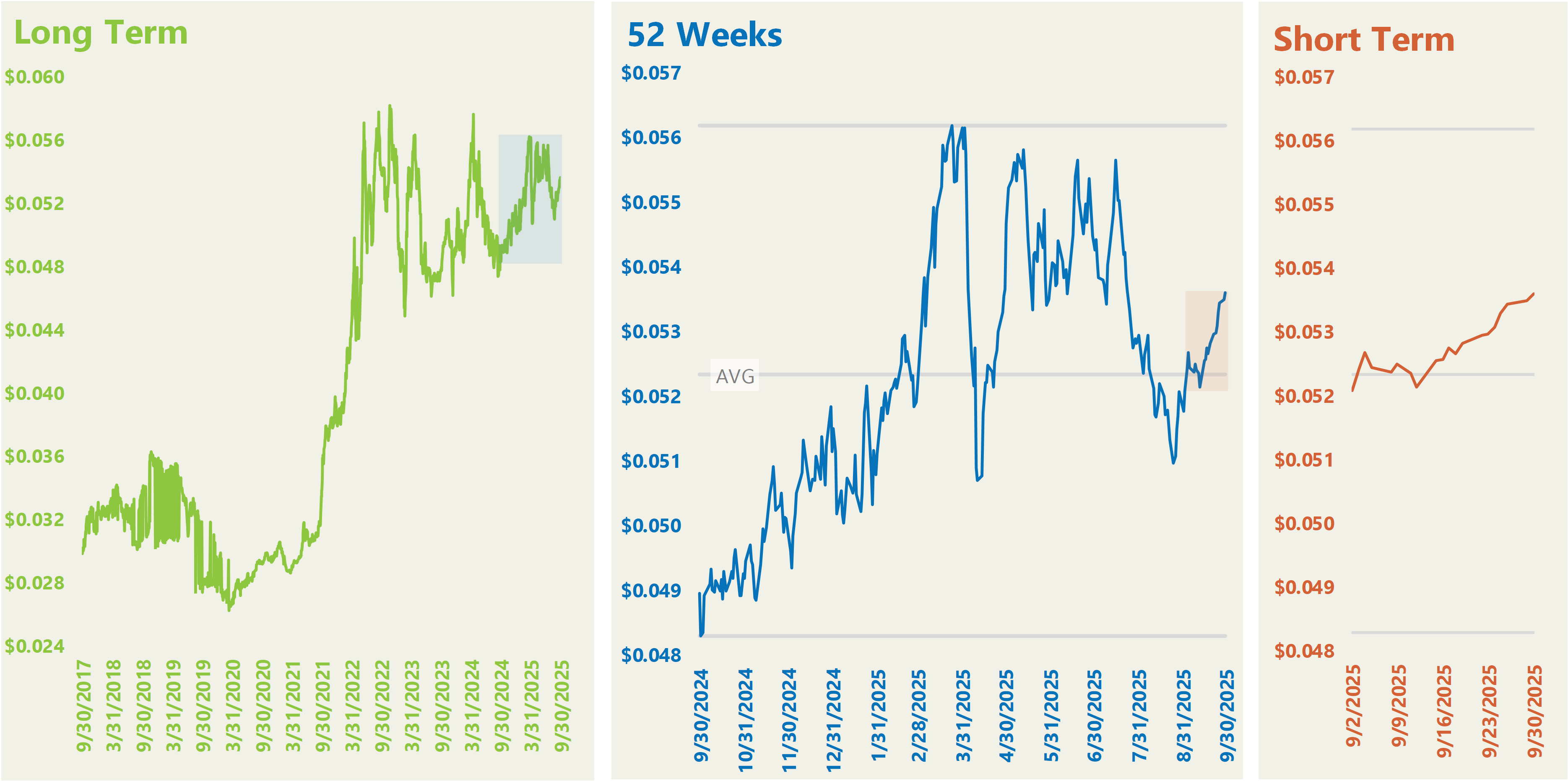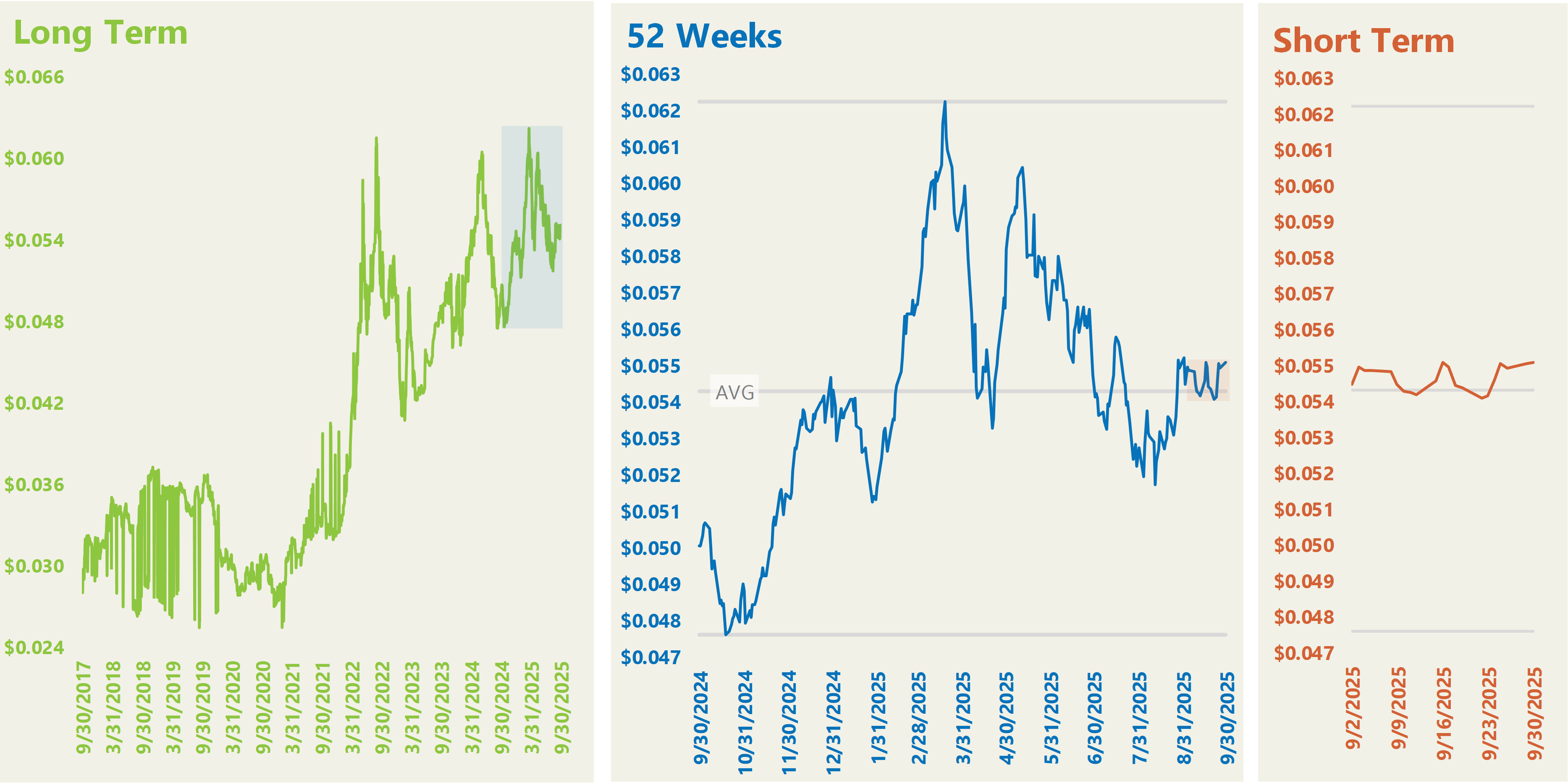The graphs above show the price movement of Calendar Year 2026 TETCO-M3 Wholesale Naural Gas over various periods of time. The price of the calendar year is shown on the left y-axis in relation to the date of the pricing on the bottom x-axis. On the 52-week and short-term graphs, you can see the minimum, maximum, and average prices of the past 52 weeks indicated by the gray lines.